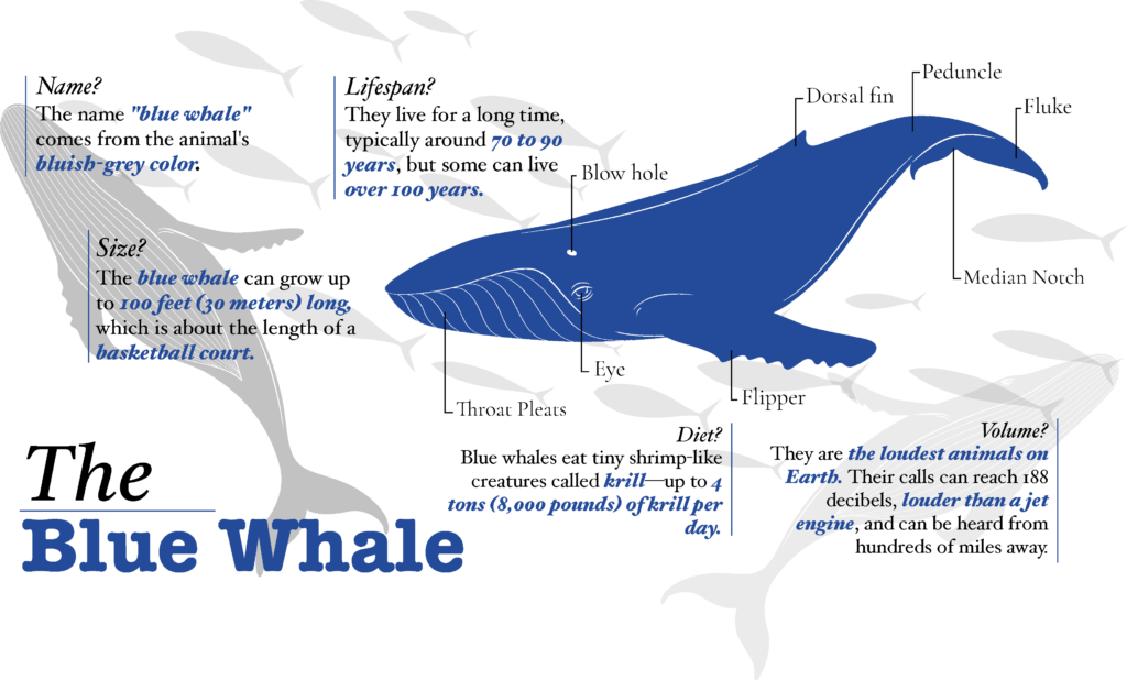 Für die Infografik des Blauwal habe ich einen beruhigenden Blauton gewählt. In dieser Grafik habe ich die verschiedenen Körperteile des Wals klar benannt. Zudem habe ich interessante Funfacts über seine Größe und sein Verhalten integriert.