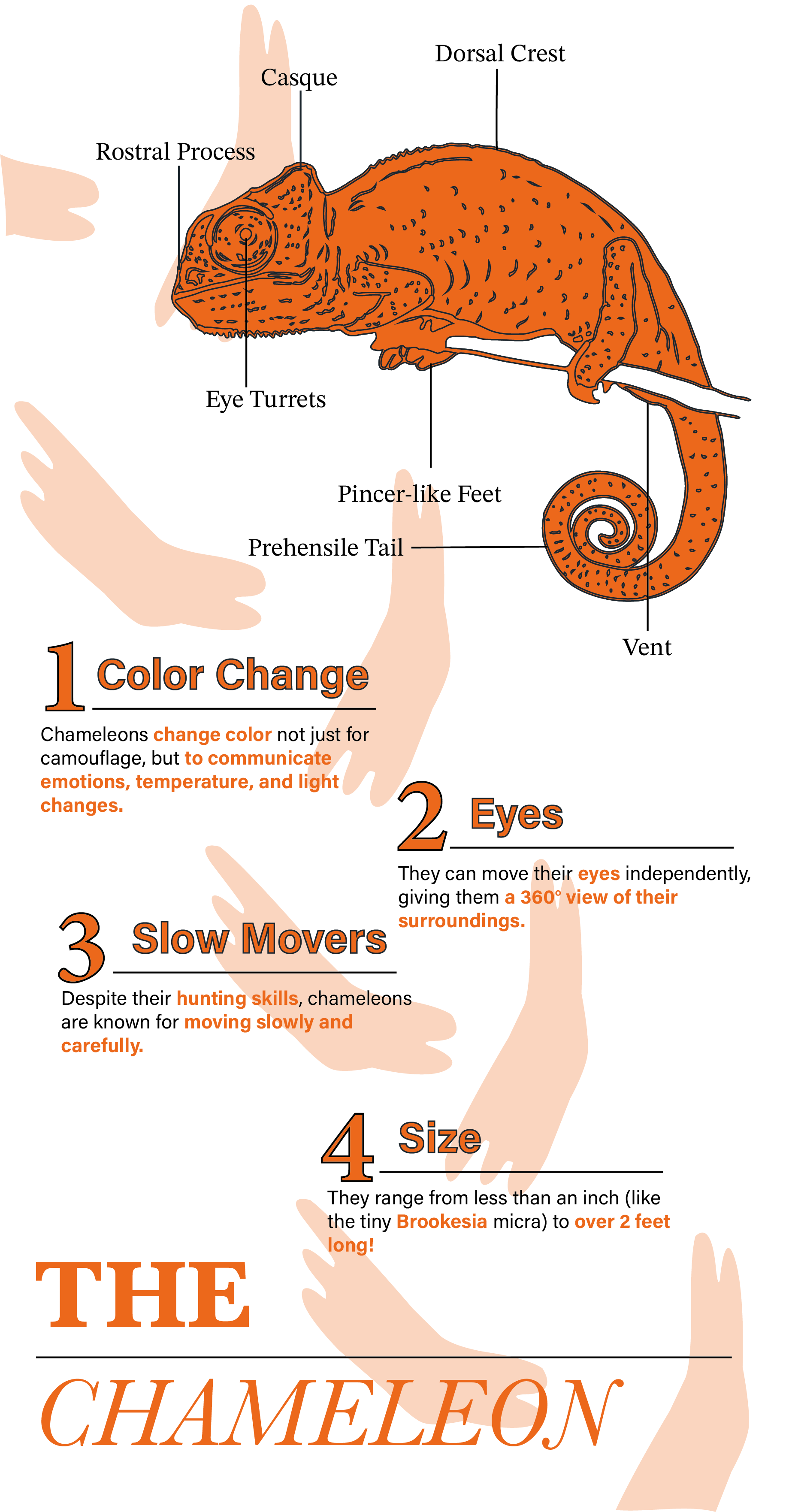 In meiner Infografik über das Chamäleon habe ich es in einem auffälligen Orange dargestellt. Ich habe die verschiedenen Körperteile benannt, um Verständnis für seine Anatomie zu ermöglichen. Ergänzend dazu findest du interessante Funfacts über die Farbwechsel-Fähigkeit des Chamäleons.