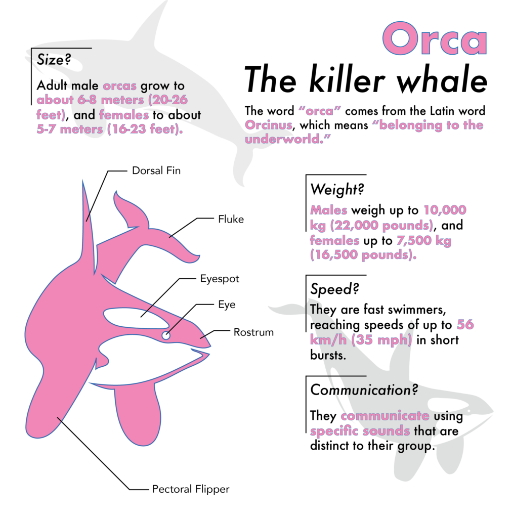 In dieser Infografik des Orcas in einem auffälligen Pink erstellt. In dieser Grafik habe ich jedes Körperteil des Orcas benannt, um die Anatomie besser zu veranschaulichen. Zusätzlich habe ich einige spannende Funfacts über seine Intelligenz und soziale Struktur hinzugefügt.